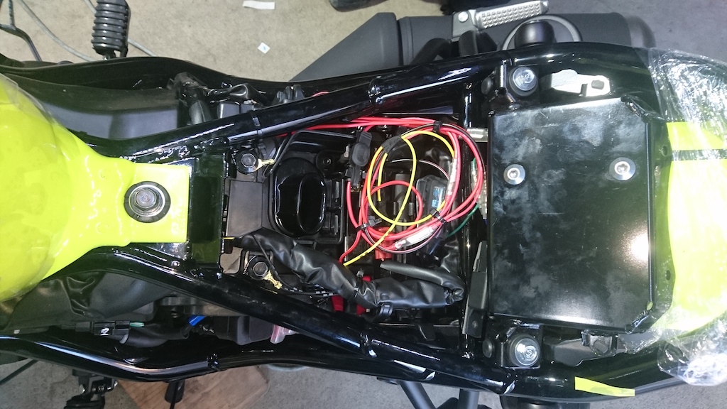 壊れたか? ヒューズか? 色々な事が頭をよぎります。 途中で見える部分の配線も確認しましたが問題無し。 帰宅してからシートを外して(買って2週間で何度外した事かw)ヒューズやらタンクも持ち上げて途中配線を確認(タンク外しの実験でやらかしたかと)しても特に以上なし...で、ふとシート下の丸まった配線を見るとギボシが一個外れてますw きちんと接続してスイッチを入れると無事に即座に暖かくなりました(汗・汗・汗 一番単純なしかもパッと見て分かるところじゃん(ノ´∀`)ノ♪