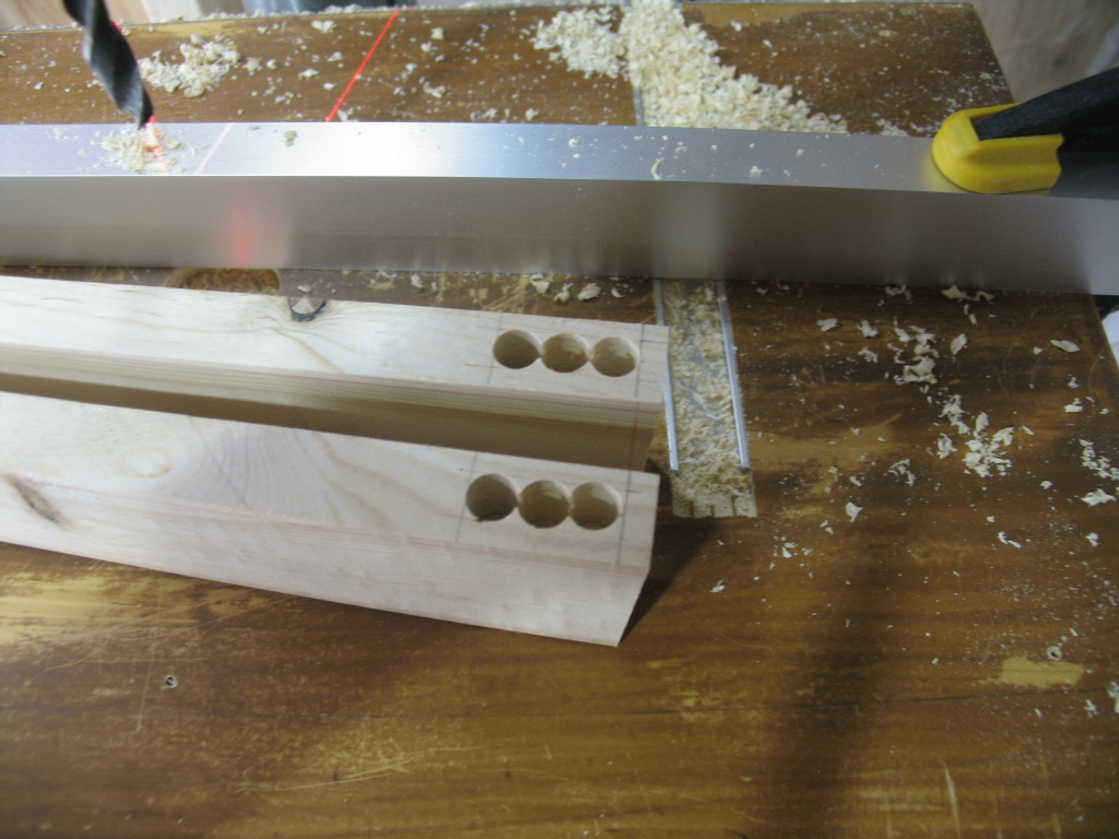 最初フリーハンドでやっていたら、穴がぶれてしまったので、あわててフェンスをセットしました。手前がフリーハンド、奥がフェンスを使って加工したもの。