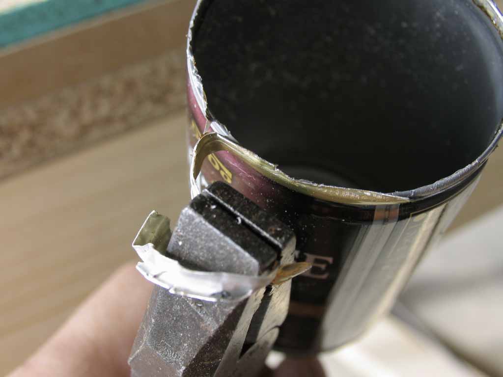 これならカットした時と違って手で触っても危なくありません。部分的にきれいに取れなかったり、下地が破れてしまった場合はペンチで挟んで修正します。少量のペンキや塗料の入れ物に最適。今日はボンド付けに使用します。