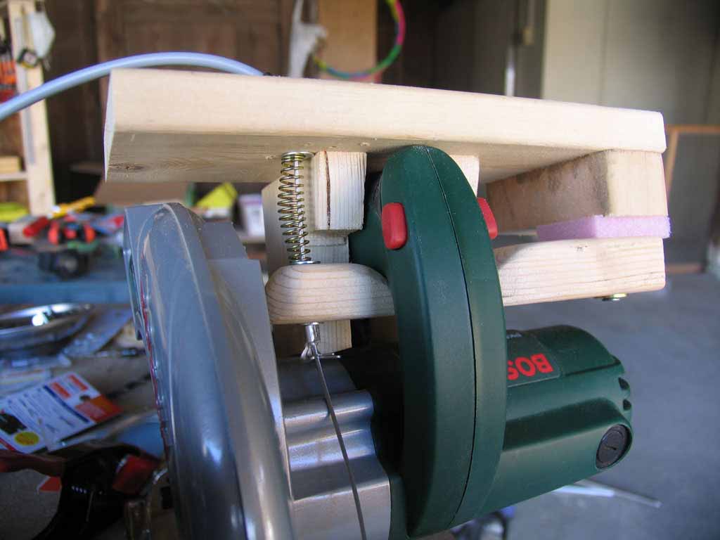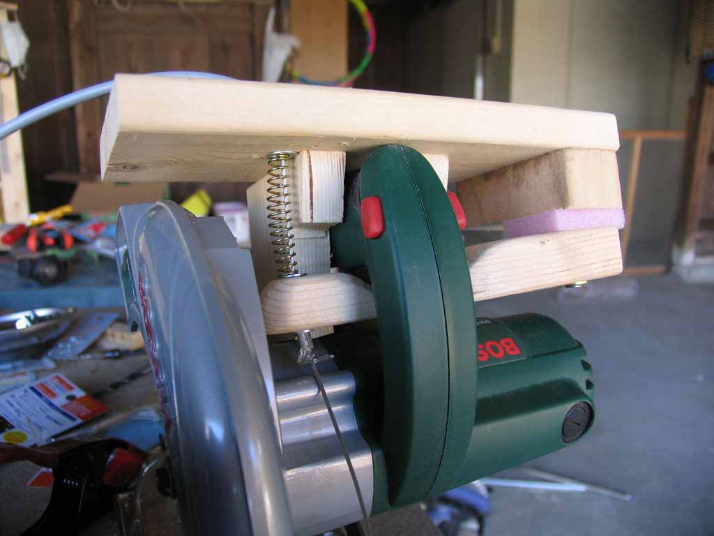 フット式の3路スイッチを探しましたが見つからず、普通の電気式3路スイッチにするか悩みましたが、試してだめなら電気式にしようと思い作った物です。なんとかうまく行きました。丸鋸のブレーキもちゃんと動作します。