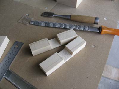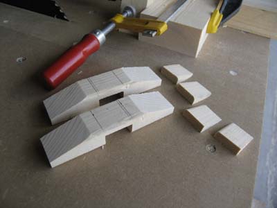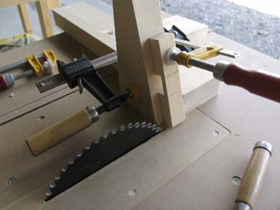 次にクロスカットジグに斜めカットされた2x4の端材をセットして先ほどの溝切りした材料をセット