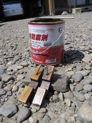 長いビスを付けて防腐剤の缶の中にどぶ付け。