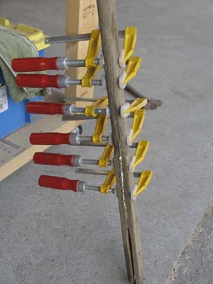 その合間に柄の修理です。ボンドを付けてクランプで圧着。