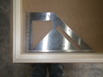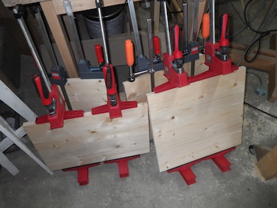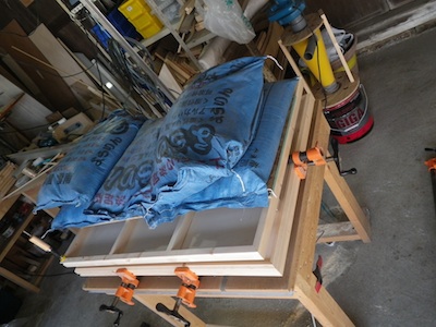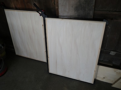 溝にシナベニヤをはめ込んで、ベルトクランプで圧着します。