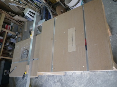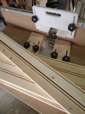 その後テーブルソーにトリマーテーブルをドッキング(といってもクランプで固定しただけ)して、フェンスを使ってサイズ通りに仕上げました。
