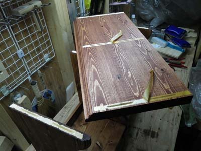 塗装も無事に終わり、ワトコオイルのミディアムウォルナット、チェリーの重ねぬ璃をした部分の仕上がりも上々。いよいよ天板を取り付けます。