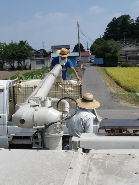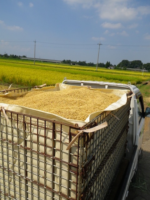 カゴ1杯で、およそ8俵。田んぼ2枚およそ6反程度を狩って、5.5杯分40俵強ですかね。