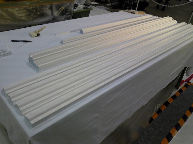 左官は発泡スチロールベースに石膏を流して(型でしごいて)装飾縁を製作しています。