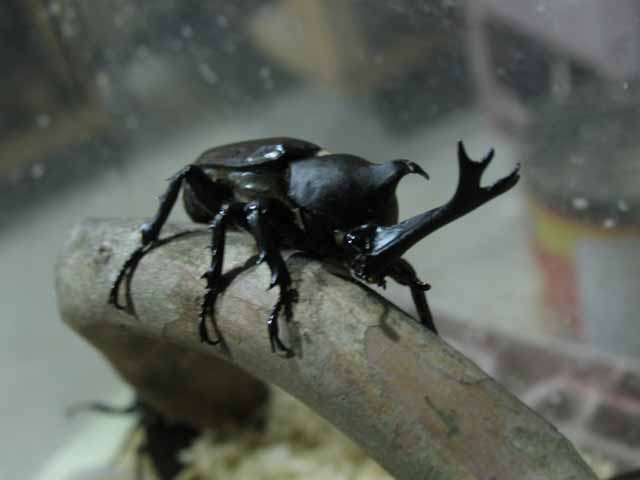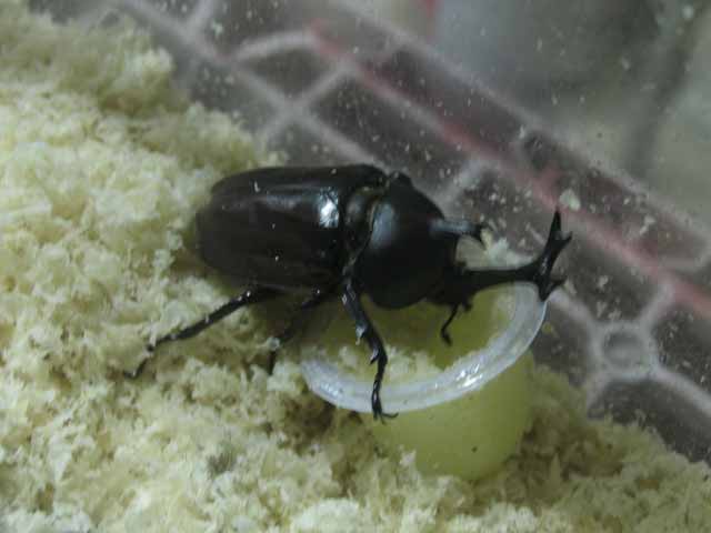 下でエサをつついているのが、昨日のカブトムシ、枝の上が今日のカブトムシです。