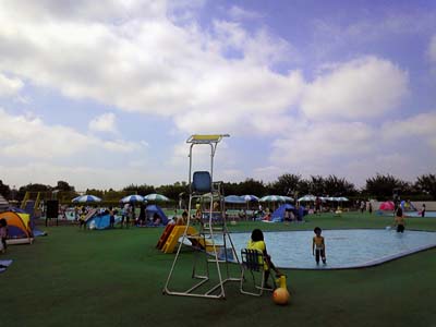 昨日同様鬼のような暑さなので当然人はいっぱい。家族向けの小振りなプールながら、流れるプールやスライダーなどもあるところなので、今日のような天気のときはかなりの人でにぎわいます。