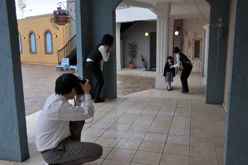 女性スタッフ2名とカメラマンの3人体制で、何度見ても感心する手際の良さでうまく子供の笑顔を引き出しながら撮影が行われました。 スタジオ内・屋外(天気が悪かったのがとても残念)約10カット計50枚くらい撮影しました。