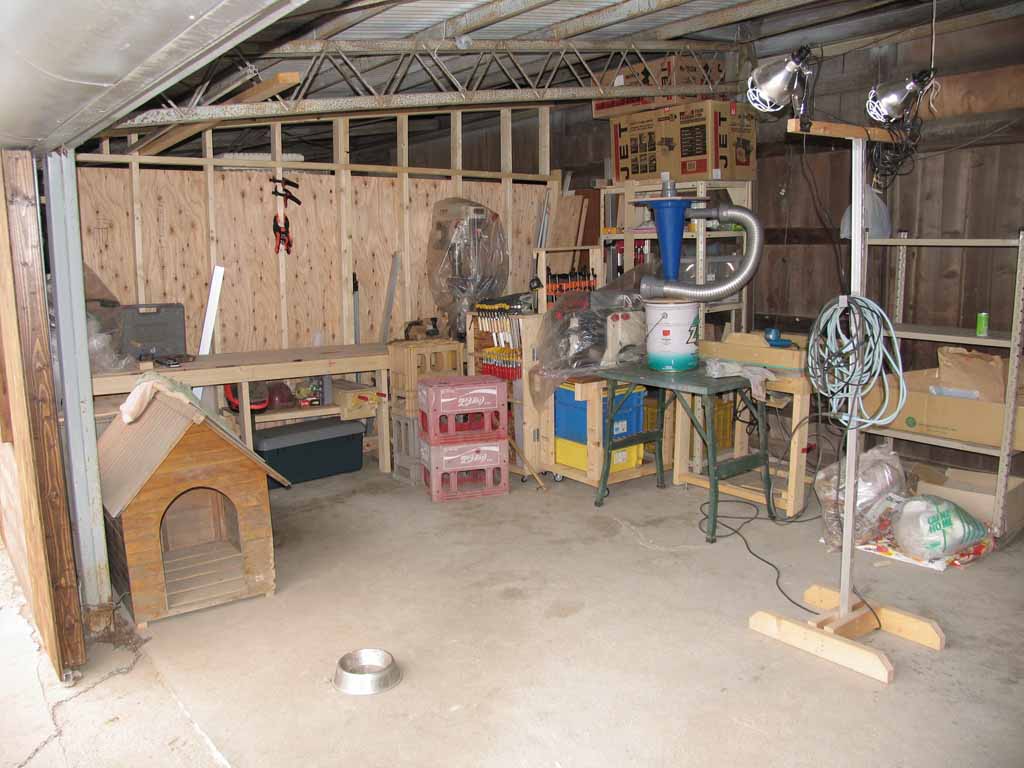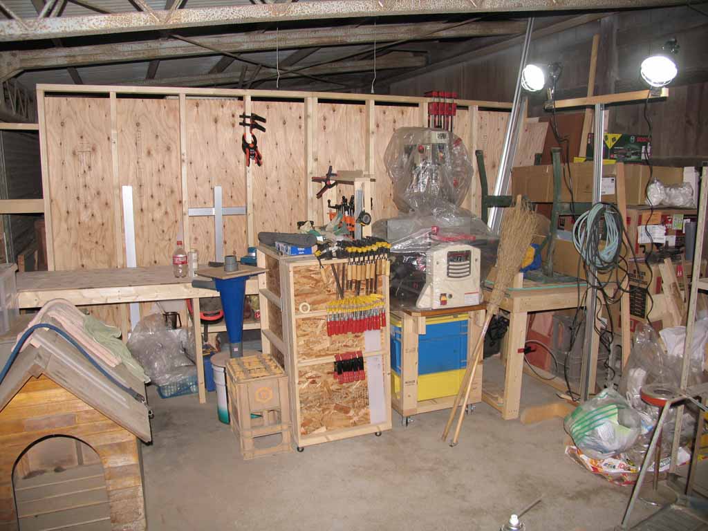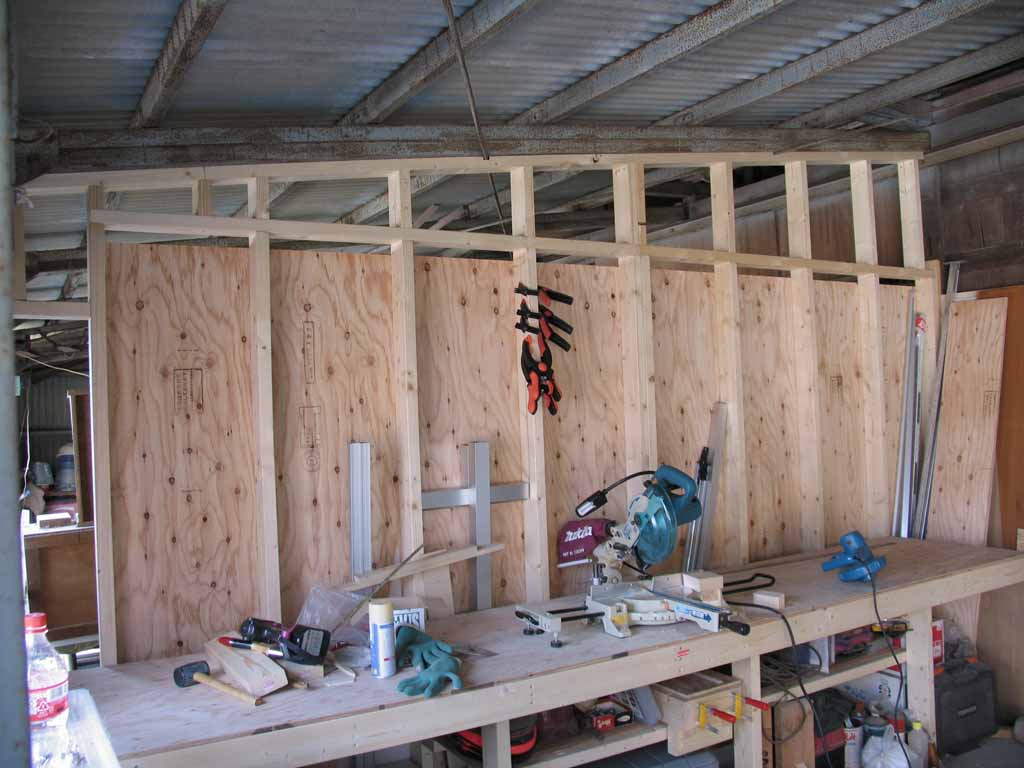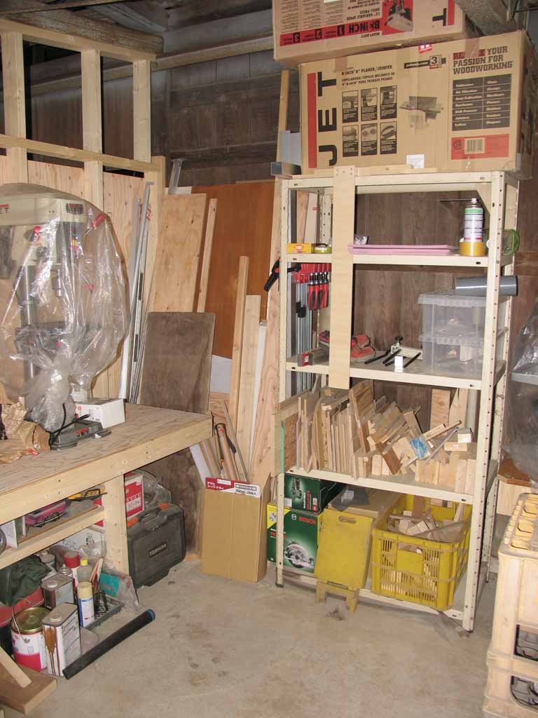 作業台の部分は物をよかすこと無くアクセスできるので、塗装などの軽作業なら今までのように物を引っ張り出さなくても作業ができます。まだ上部と一部の壁が貼り終わっていませんが、明かり取りにポリカの波板でも貼ろうと思ってます。