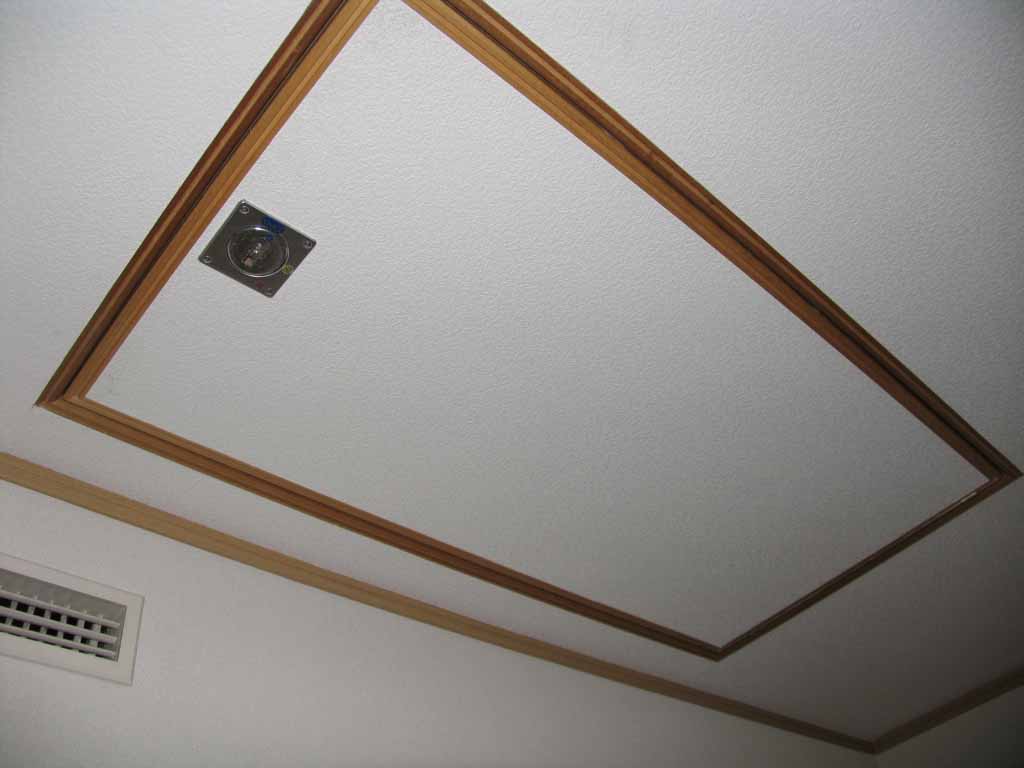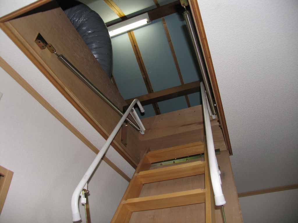 天井にある扉を開けると小屋裏に上がれます。