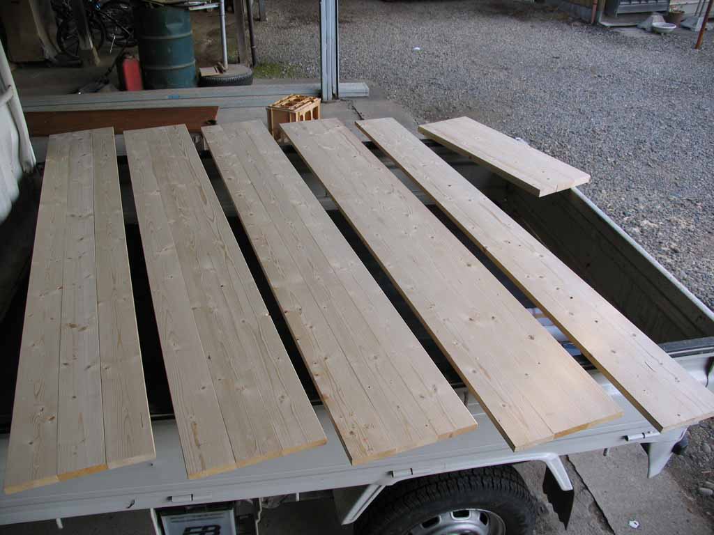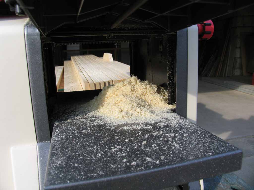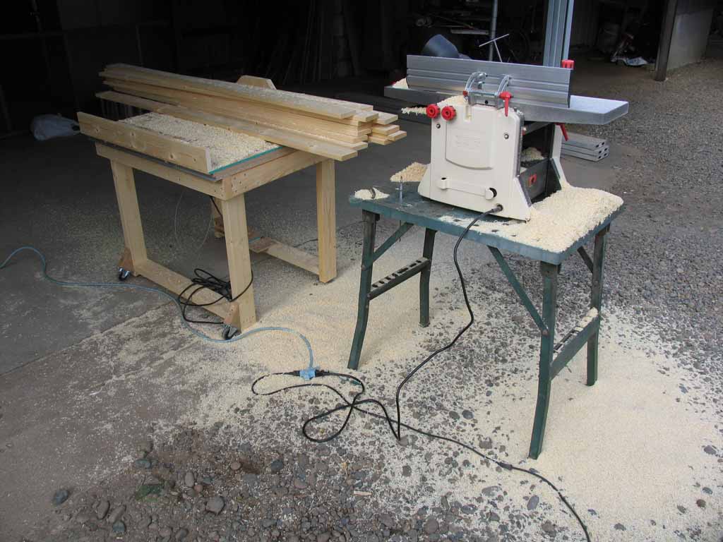 一度ブロアーで吹き飛ばしてから1x4をプレナーがけ。14本を18mmにしました。材料が薄いせいかジョインターにかけると手で押さえている所しかうまく削れず、かえってボコボコにしていまいそうなので、1x材はいきなりプレナーをかけました。