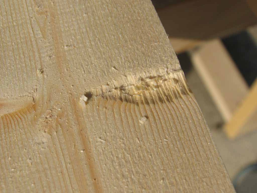 なんだかどこかで見覚えのある傷跡.......そうだ売り場で材料を買う時にいつもよけてる奴についている傷だ.....節を削った時に刃でえぐれてしまうみたいです。どうして新品のカンナがけしてる材料にこういう傷がつくのか不思議だったのですが、節が原因だったんですね。