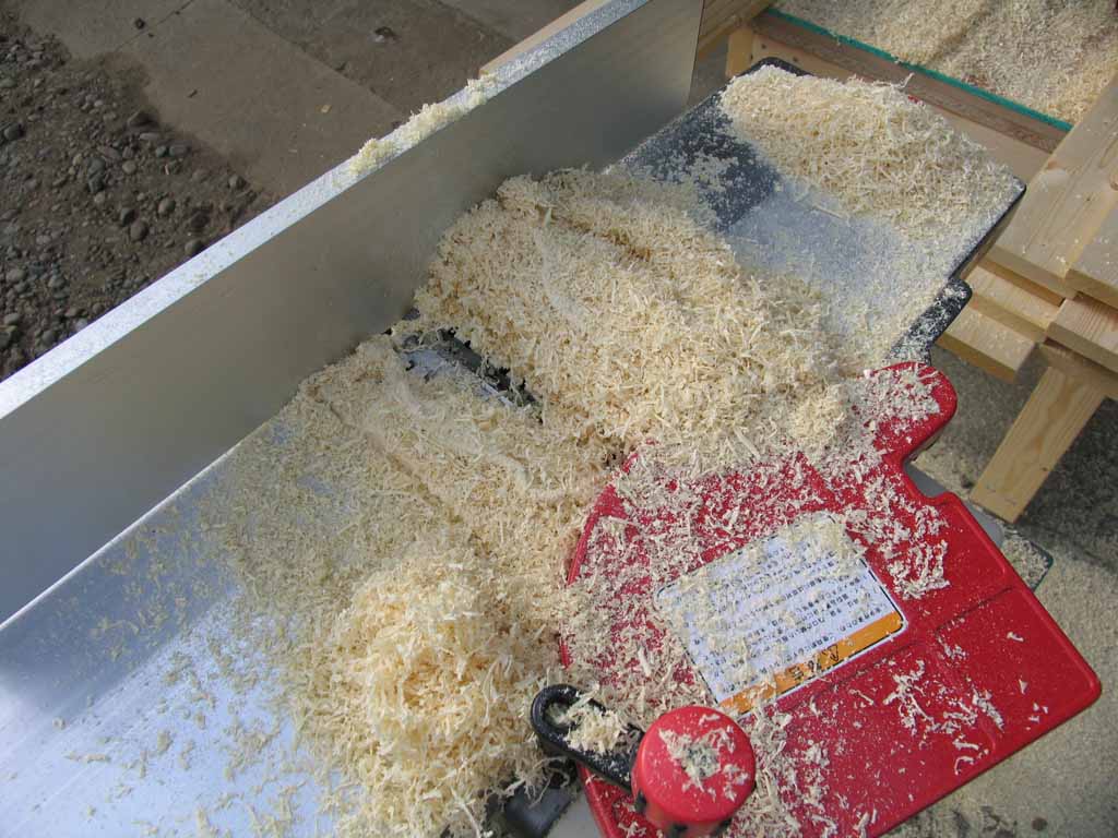 2〜3回材を通すとあっという間に屑がつもっていきます。排気口が上を向いていて削った勢いと刃の風圧で屑が飛ぶだけなので、集塵を付けない状態ではすぐにいっぱいになって他からあふれてきてしまいます。