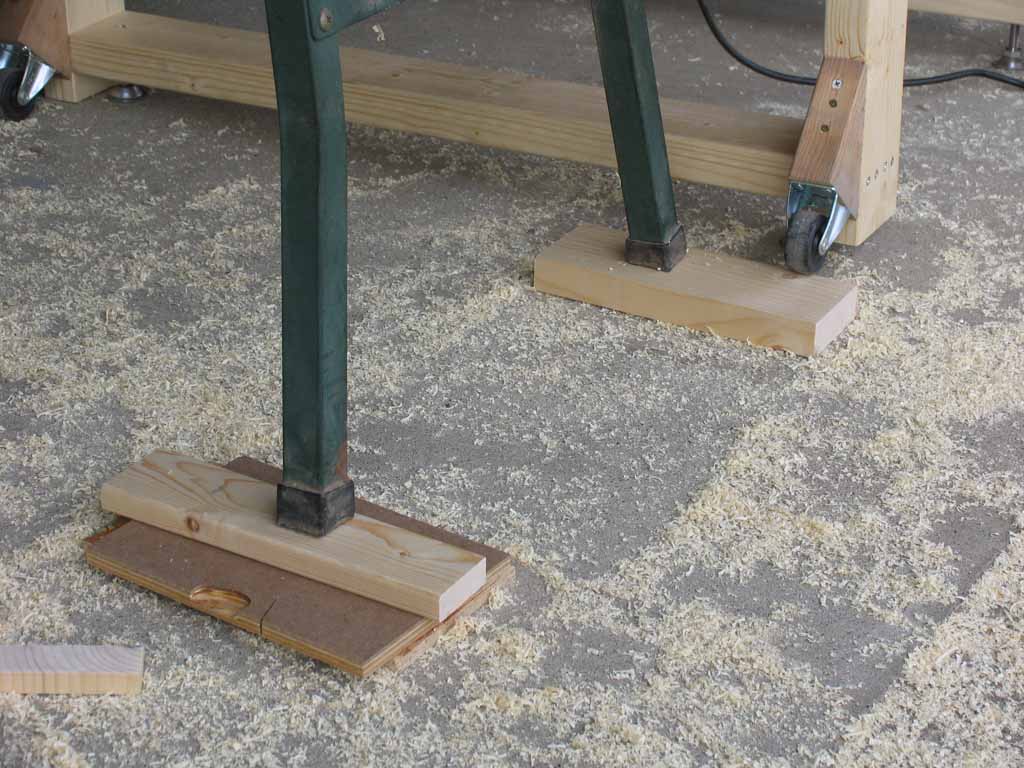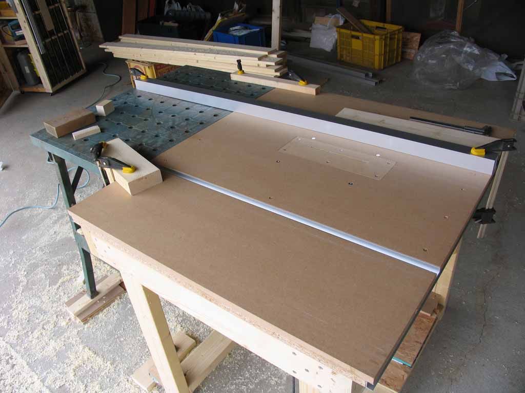 今度は板継ぎの接合面のリップを落とすために自作テーブルソーにフェンスをセット。後ろ側に材料が落ちてしまうのを防ぐため、作業台を並べます。テーブルソー制作時にこの作業台と高さは合わせてありましたが、何度も書いているように床の水平が出ていないので、こんな感じでテーブルソーと固定しています。