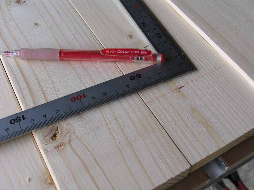 次はビスケット接合のための墨入れ。写真のように並べて3〜4枚まとめて印をつけます。スプラはいつも0.7mmの赤い芯のシャープペンで墨!?を書いてます。