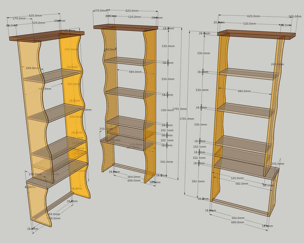 先週の板継ぎの段階で板厚が変わったりしたので、図面を修正しました。いつも通りSketchUPを使ってます。これを元に2Dの3面図(正面・側面・平面)を描こうかとも思いましたが面倒なので、かわりに寸法のつけ終わった物をコピー。角度を変えて3つ並べてみました。これなら隠れて読みづらい寸法も3つのうちどれかで確認できます(読み間違いに注意が必要かも)