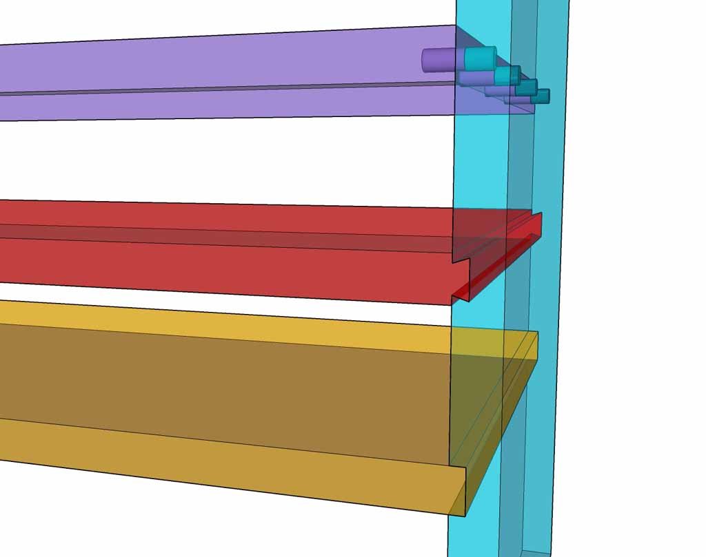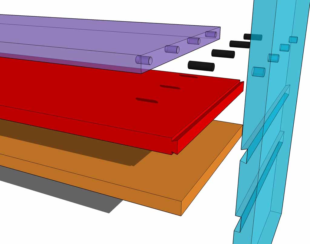 恥ずかしながらダボ加工も組み立て家具で組み立てただけで、自分で加工したことはありません。なのでとりあえずSketchUPでイメージ図を書いてみました。皆さんご存知と思いますが、上からダボ(8mm)アリ溝・大入れ。