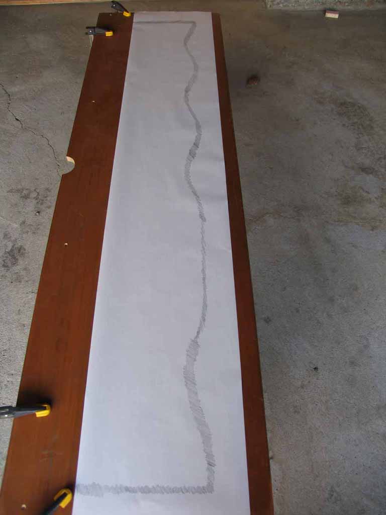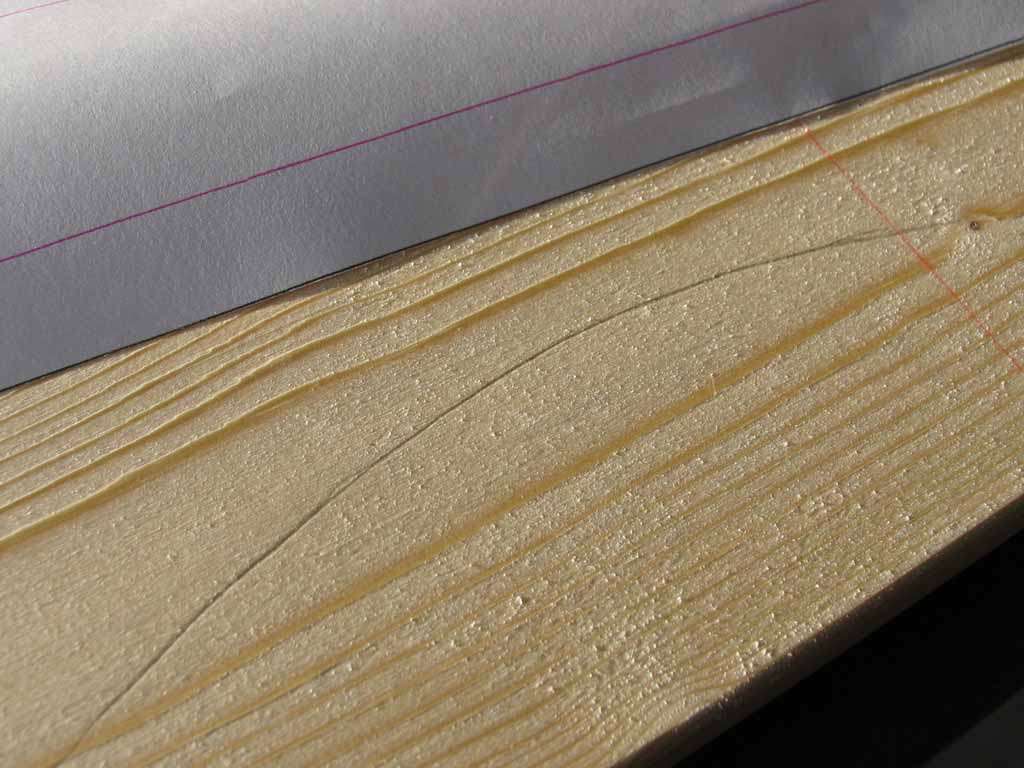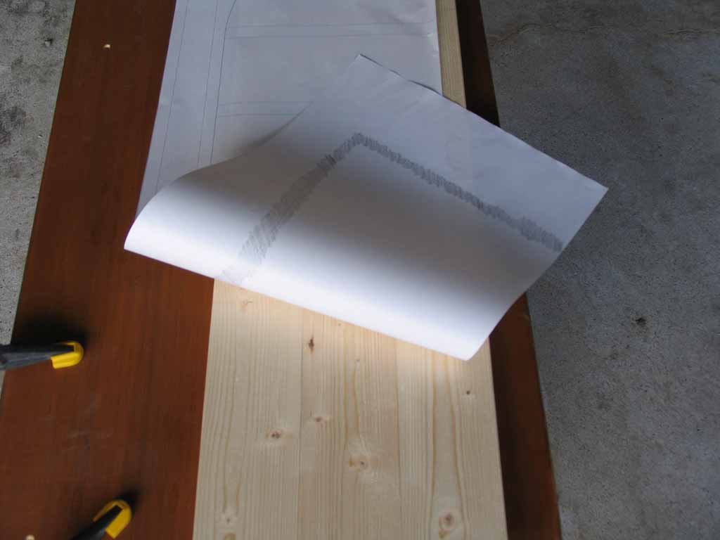 カサカサした部分の芯カスが木にうつります。SPFのように柔らかい材料の時はカサカサしなくても跡がつくので、それでもいいかも。紙と一緒に切ってもいいのですが、途中破れたり、挟まったりしていやなので、こんな方法でやってみました。