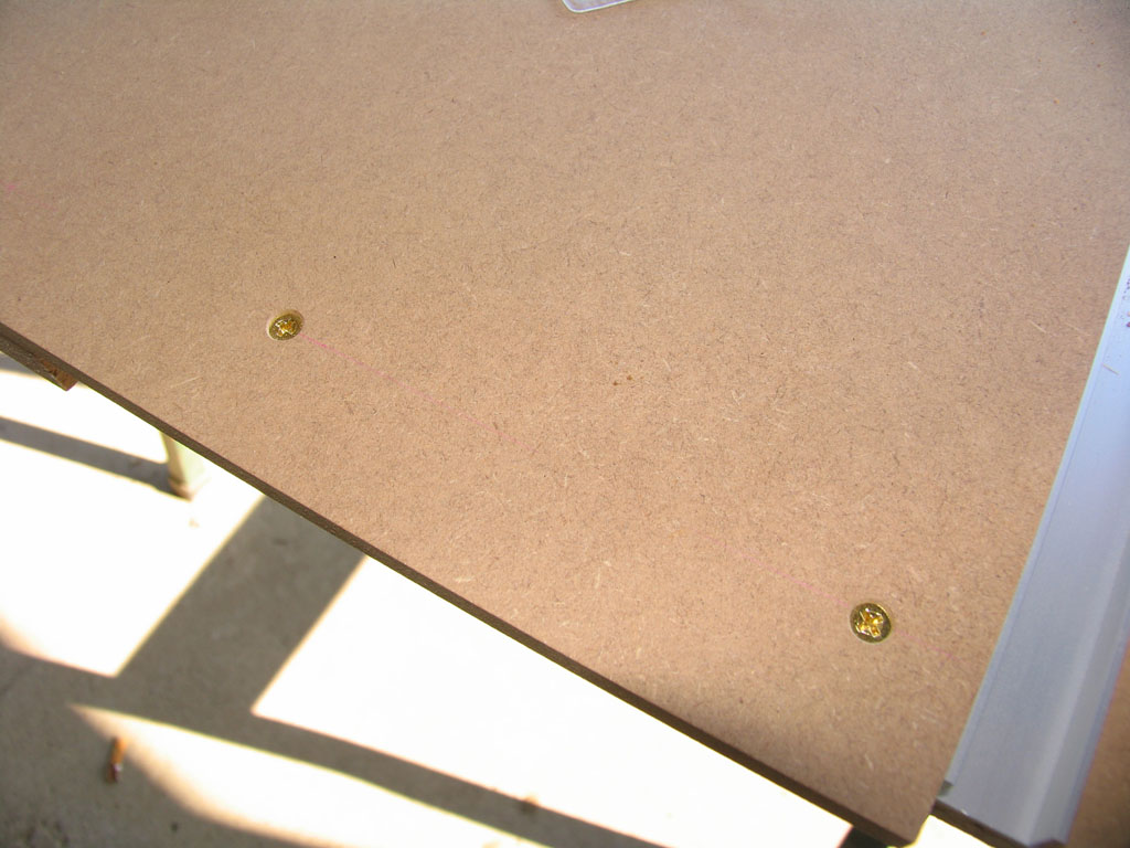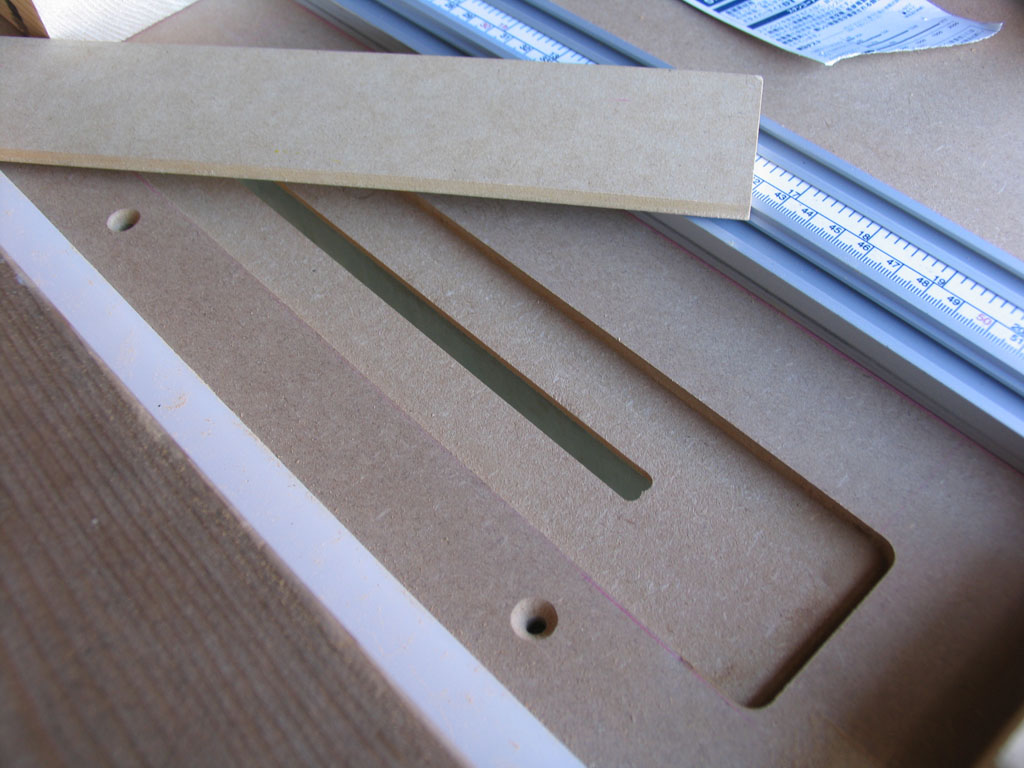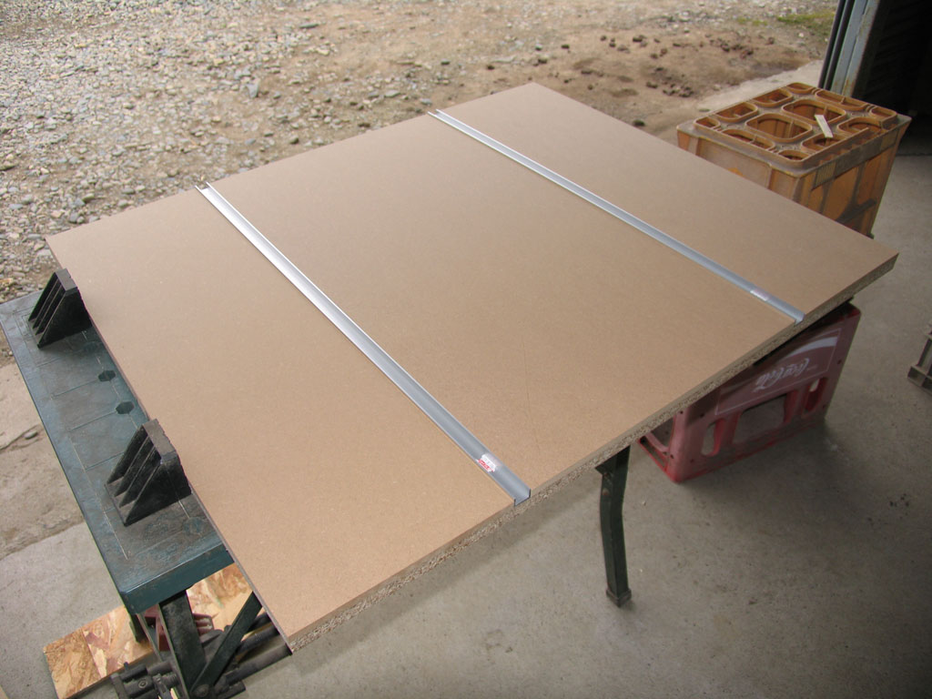 天板サイズはw900、d750にしました。縦引きにd750は短い気もしますが、その時は延長テーブル(補助ローラー)でも考えます。アルミCチャンネル20*12*2tをクロスカットスレッドやマイターフェンス用のレールにします。MDFとパーティクルボードは、あらかじめ購入店のパネルソーで指定寸法にカットしてもらいました。下は仮組した写真。