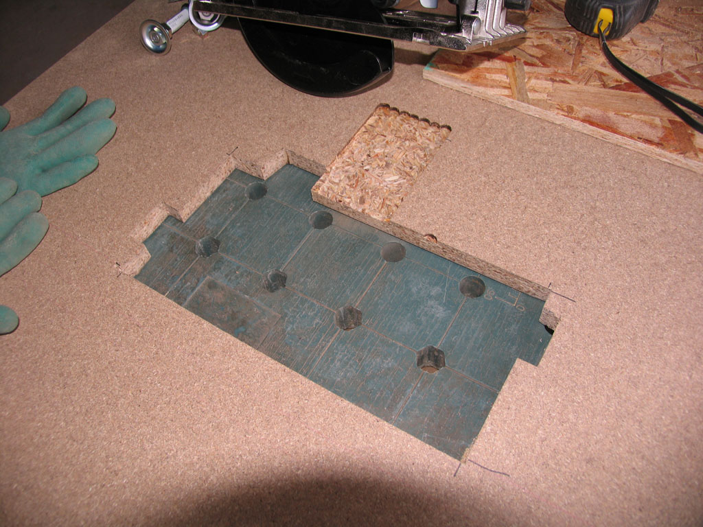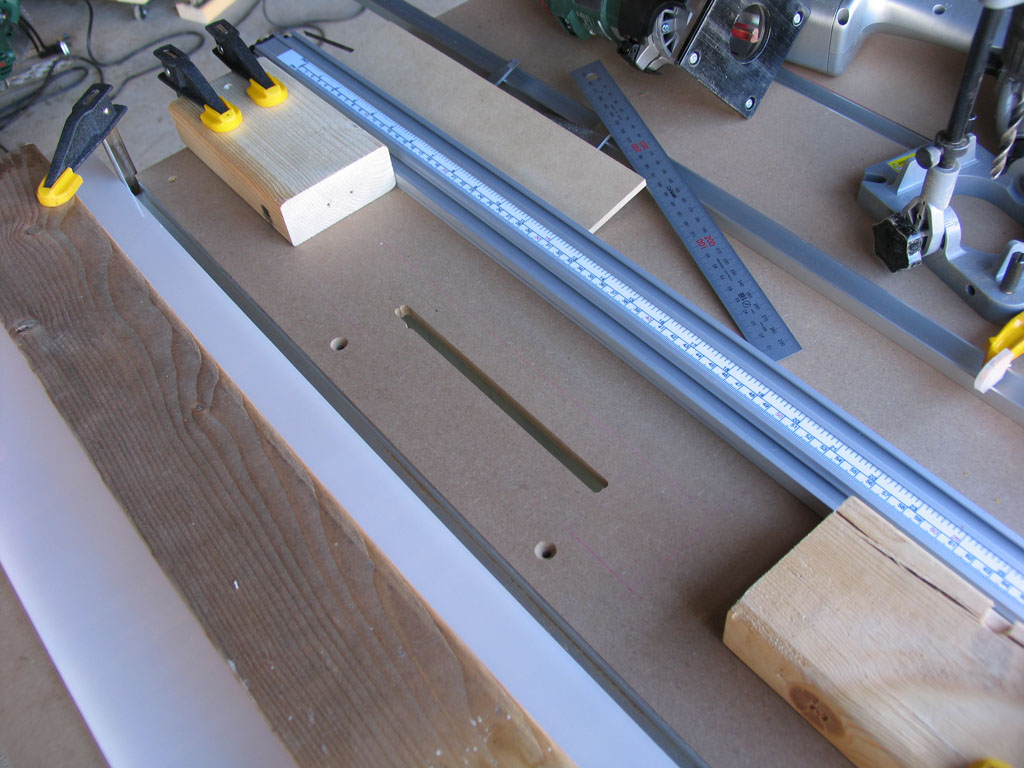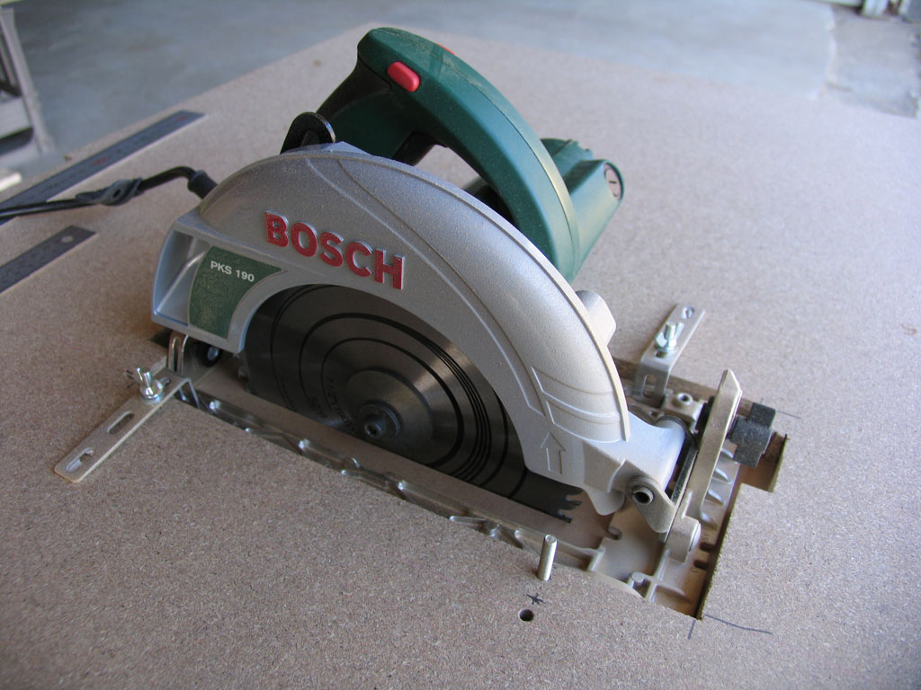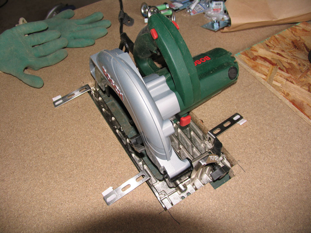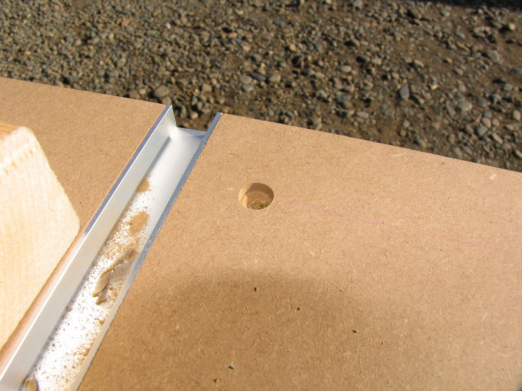 次にパーティクルボードに丸ノコを納める部分の穴を開けます。後からレールとの平行が調整できるように、穴は気持ち大きめに開けています。モータ部も干渉するためトリマーで4mmほど彫りました。