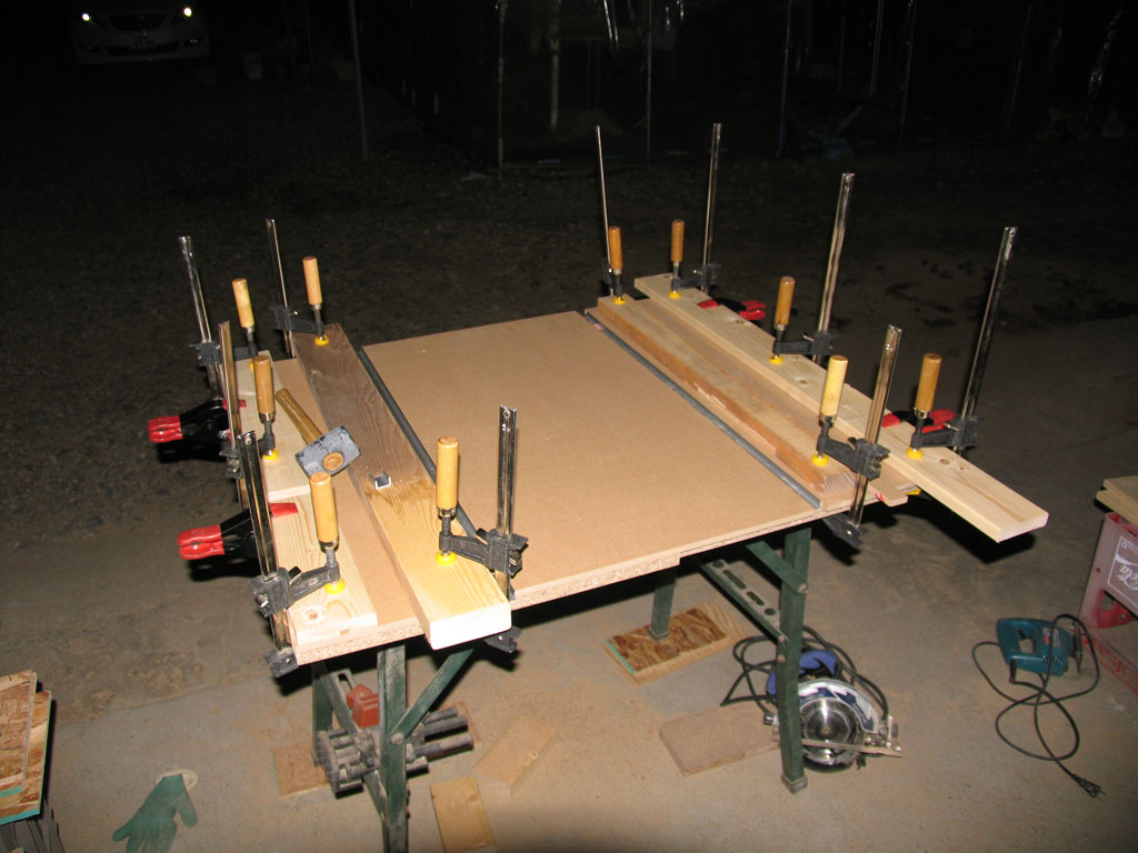 さていよいよ天板の張り合せ。中央部はメンテナンスのことも考えてボンド止めはやめてビス止めにする予定です。両サイドのみボンドをつけてクランプで圧着しました。クランプが安物のためか、締めつけると板がずれてしまいます。何度か調整しながらようやくぴったりと収まりました。
