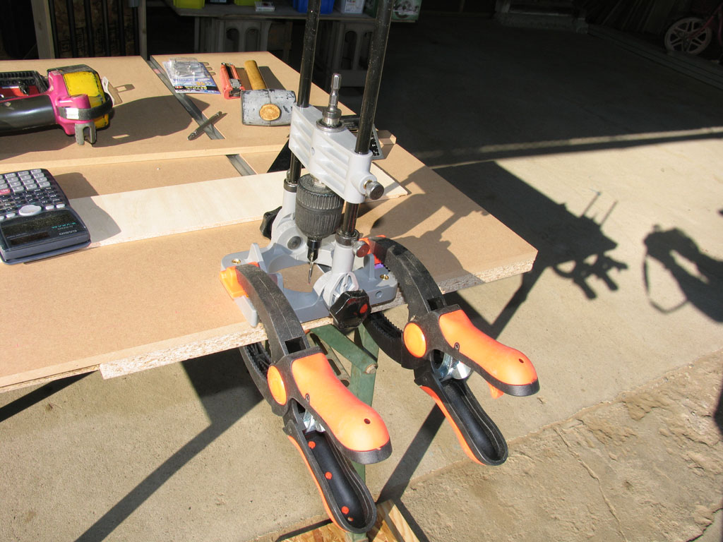 先週は両サイドのパネルの接着で終了したので、今日は中央パネルのビス止めから。ドリルスタンドを使ってした穴をあけました。