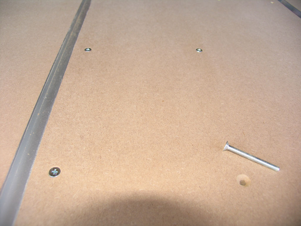 次は丸鋸固定用のビス穴をあけます。手持ちの皿切りでは5mm皿ビスの穴には小さかったためグリグリと強引に.....でもさっきの真鍮よりはうまくいきました。