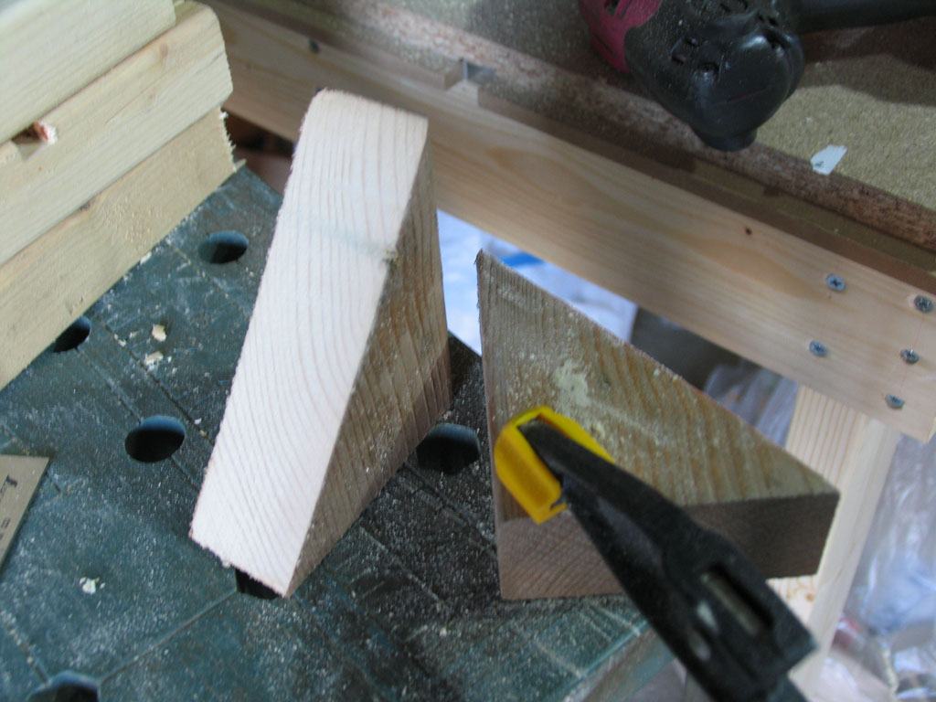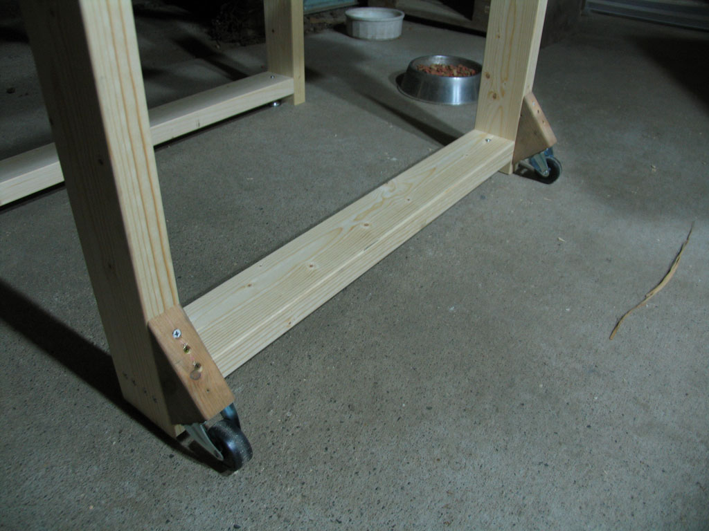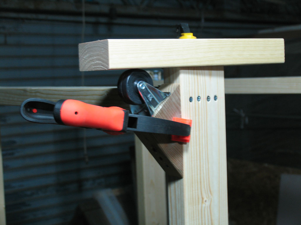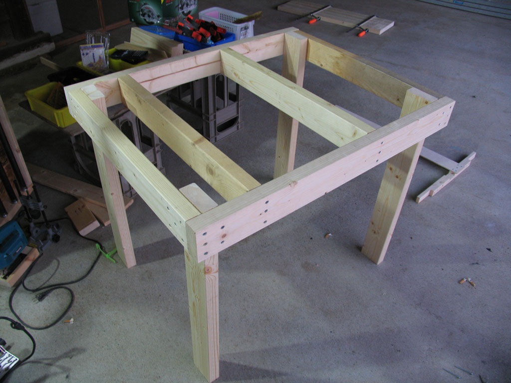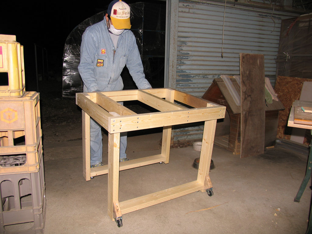 とここで、ある事に気がつきました。足が無いんです。今までは丸鋸を付けずに作業していたため、作業台の上で表裏を返しながらの作業ができましたが、丸鋸を設置してしまうとそれもできません。現物合わせで在庫の 2x4で台を作りました。