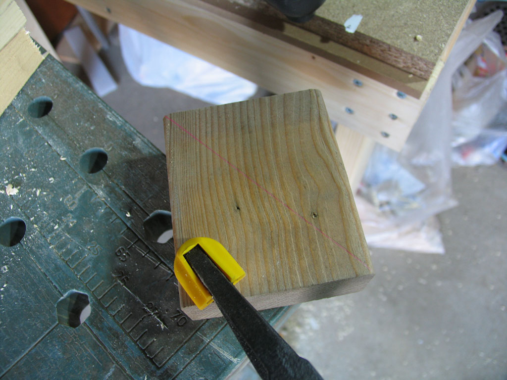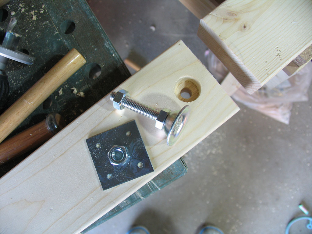 まずは2x材の端にナット付きの平板を付けるために座グリをあけます。手持ちのフォースナービットでは大きすぎるためホールソーで途中まで切り込みを入れてのみで中をさらいました。アジャスターボルト用に12mmの貫通穴もあけます。