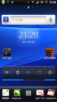 背面にあるLEDライトが点灯します。シャープの携帯端末には当たり前のように付いている機能ですが、あまりよそのメーカーさんは関心が無いみたい。ホームが面から2タッチでライトが付くのでとても便利です。