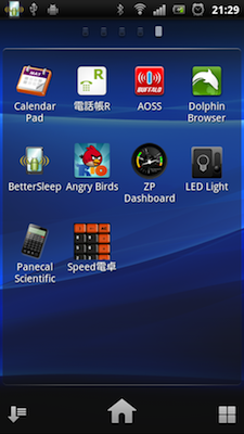 電話帳やカレンダー、ブラウザーなど、使用頻度が高いものから順に、パケ代を抑えるためのwifi設定用のアプリや、ライト、計算機等のアプリも入れました。
