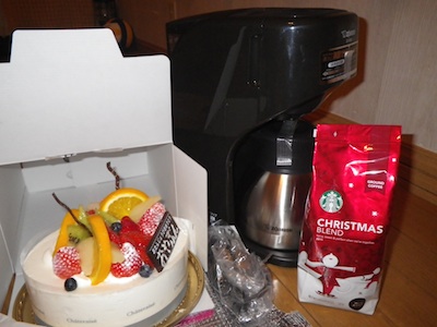 コーヒーメーカー・ケーキ・スタバのコーヒー豆です。
