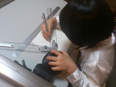 建築士の試験と違い今回はドラフター(試験は平行定規と言うものを使います。)で図面を書くので、卓上用の小型の物を学校で借りて、自宅で練習していました。正直週一の授業だけではきついッス。しかも今年に入ってからは、模型製作ばかりをやっていたので、図面を練習し始めたのは大会の2週間ほど前から。そんな状態で、数カ月前から大会のために準備している高校生に太刀打ちできるわけがありません(TOT)