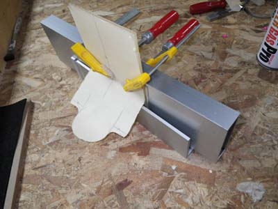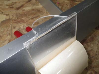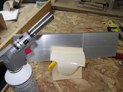 曲げ部分が適度に暖まった頃合いを見計らって、アルミアングルと角パイプでアクリル板を挟み込み、