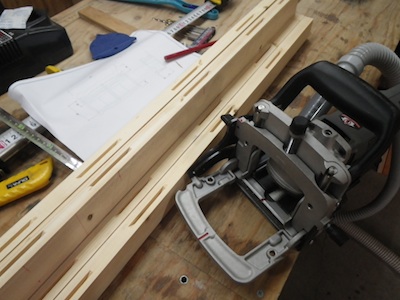 辺りも暗くなってきたので焦って作業したため途中の写真がありませんが、現物あわせしながら仕上り寸法にカットして、組み立てようのビスケット加工をして、仮組みしたのが最初の写真です。