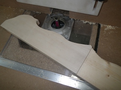 テンプレートを両面テープで貼って、トリマーテーブルにテンプレートビットをセットしてカット。