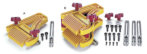 左の黄色いのが本体、上の真ん中が2段重ねで使う時のスペーサー。右が.....なんて言うんだろう?スライダー? そして中央部がネジ類。