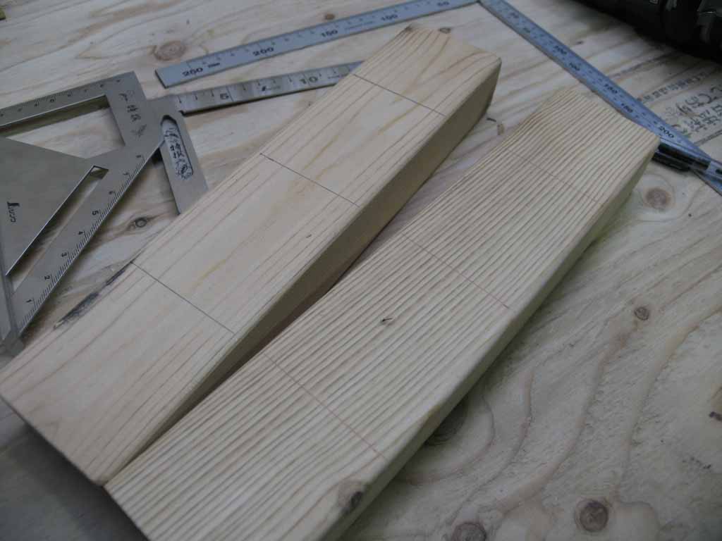 適当な端材の表・裏に、赤・黒で墨線を引いて