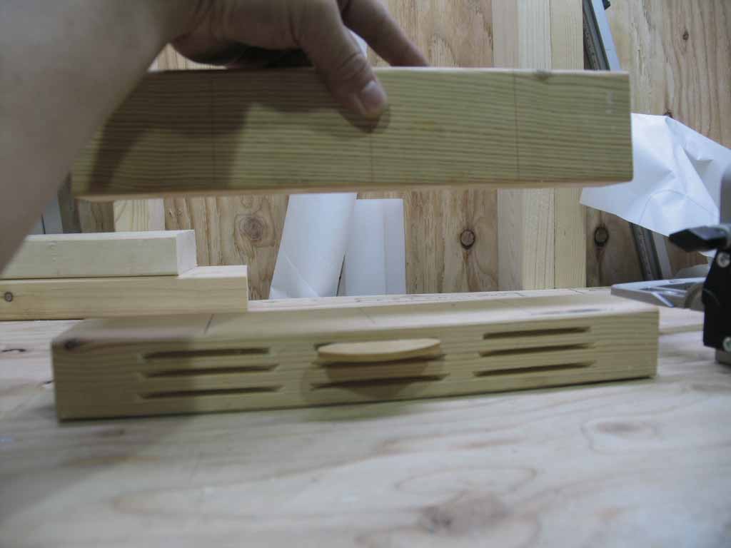 シンノスケさんがお使いのビスケットカッターはあいにく手持ちのトリマーには合わないようで、横溝ビットと自作のしょぼいジグで作業していました。