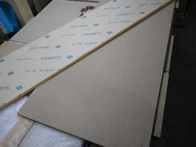 ベースのバーティクルボードに表面材のMDFを貼付けます。