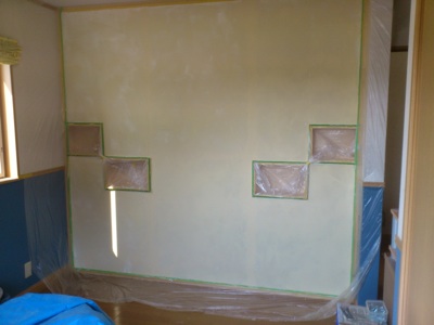 漆喰を塗る下準備としてメッシュテープを貼ってそしてマスキング。