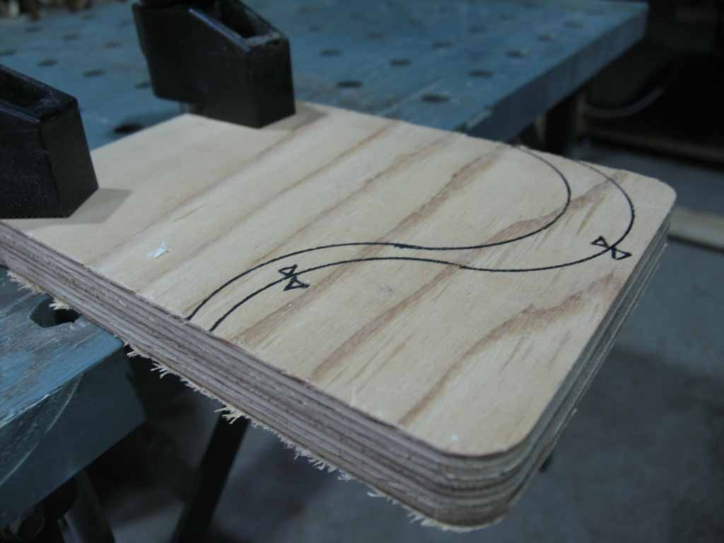 100円詰め放題の端材コーナーで入手した25mmの合板に適当にある物を利用して曲線を引きました。