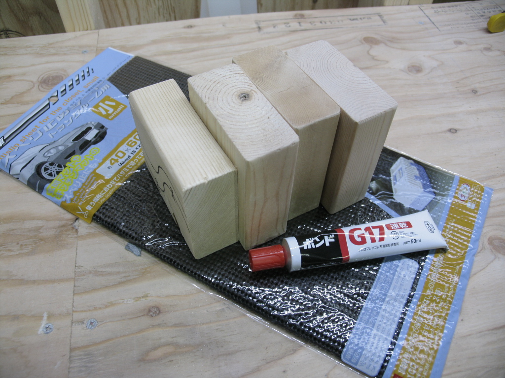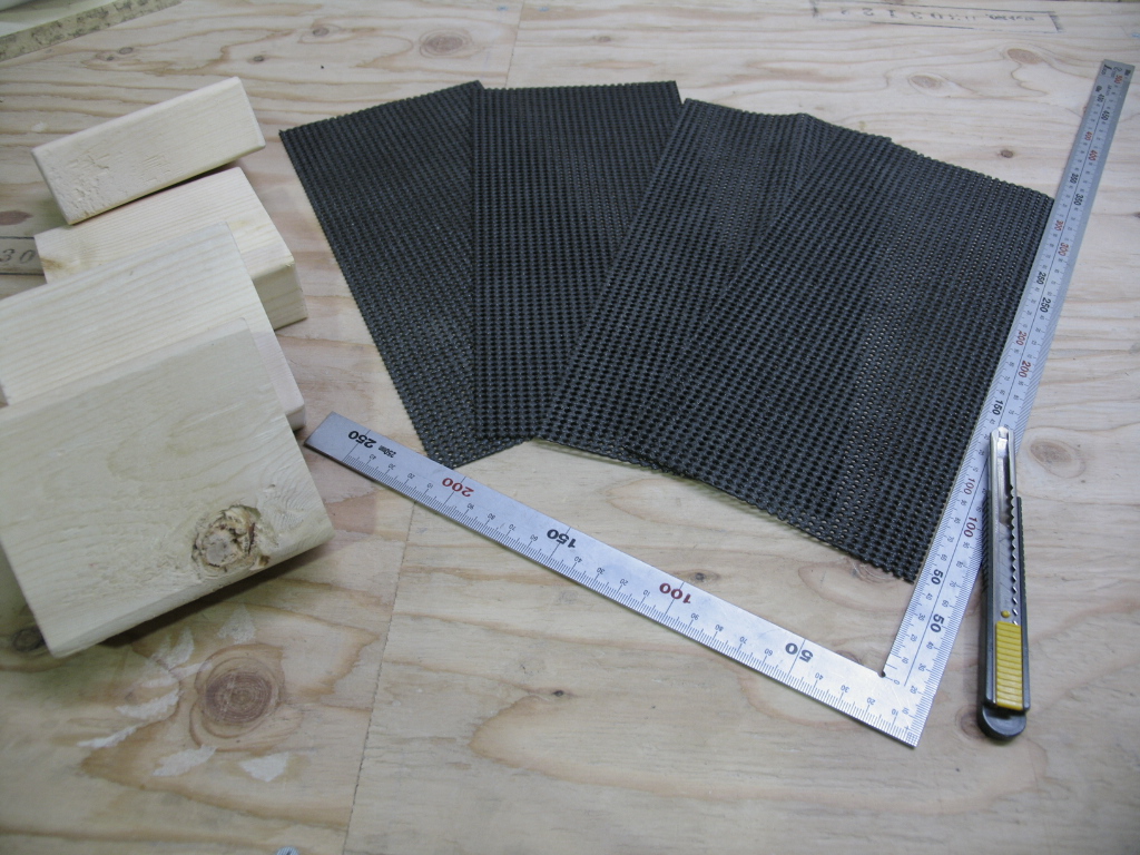 滑り止めマットを、2x4の端材にゴムのり(G17)で貼付けただけ。