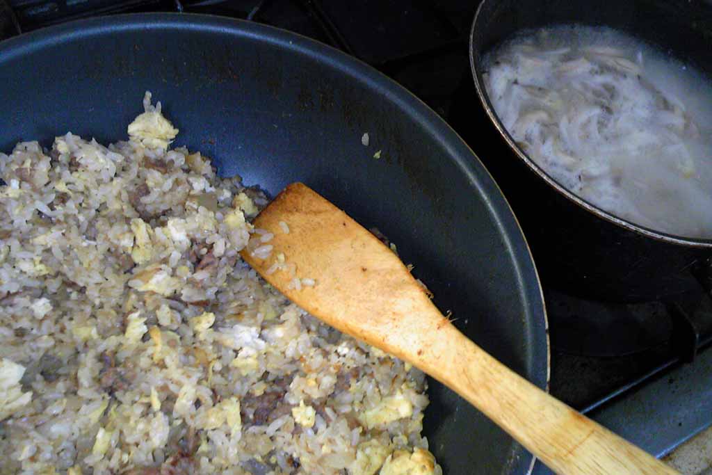 後は冷蔵庫にあったハム・シメジ・タマネギを具に、ブイヨンと塩コショウで味をつけたスープ。(写真右奥)