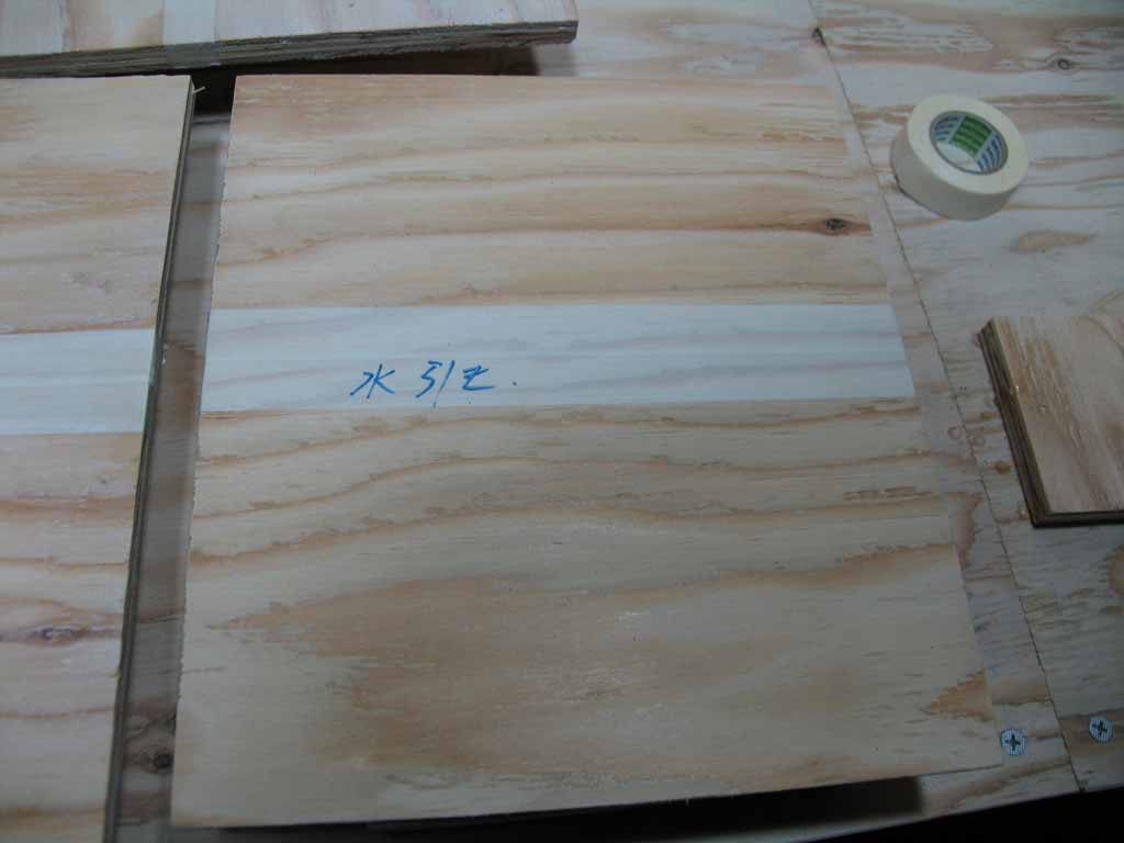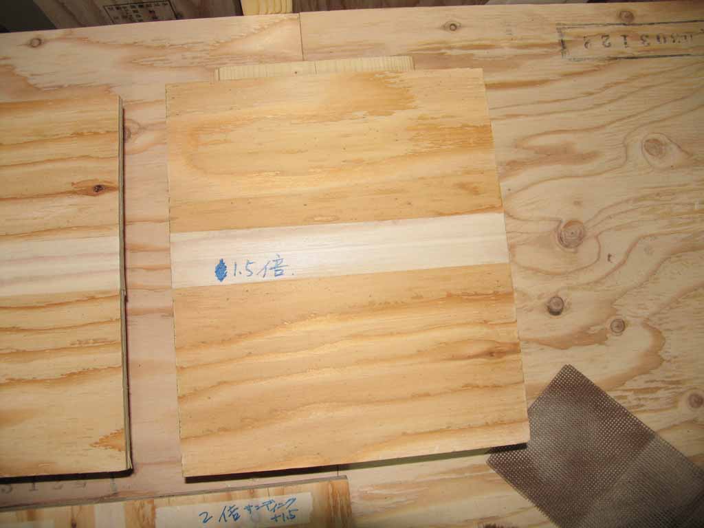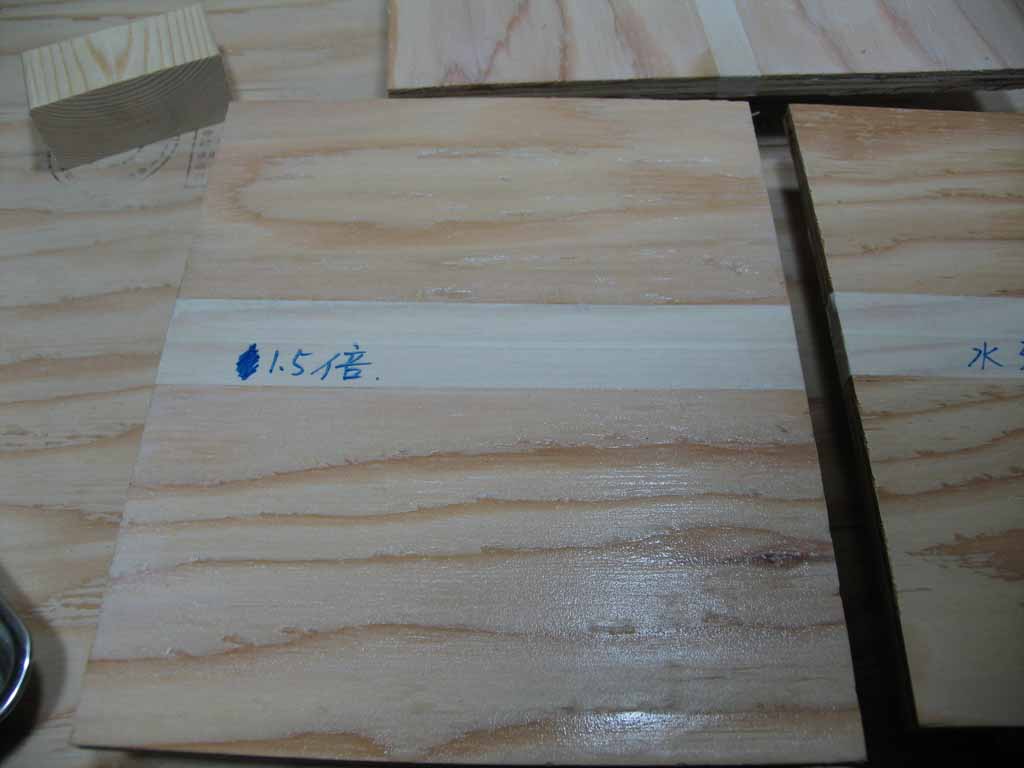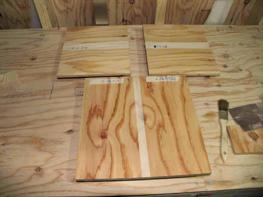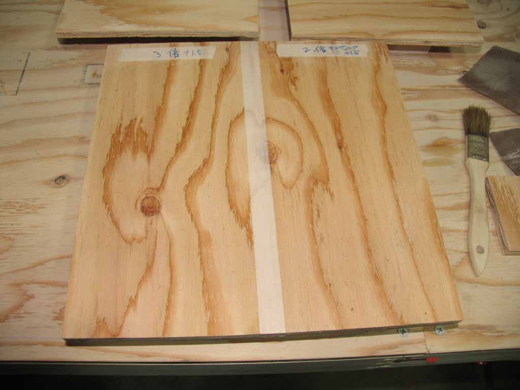 昨日サンディング後に水引をした合板に、今日の出勤前に約1.5倍に薄めた物を塗布しておきました。これで用意したサンプルは