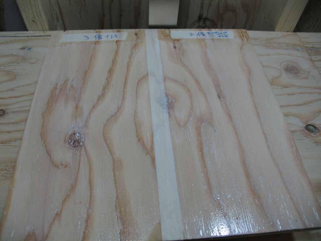 2倍、3倍どちらもそれほどの違いは無いようなので、3倍の方はそのまま1.5倍の物を上塗り、2倍の方は軽くサンディングしてから1.5倍の物を上塗りしました。節には原液に近い物で穴を埋めるようにしてから、薄めたボンドを塗りました。