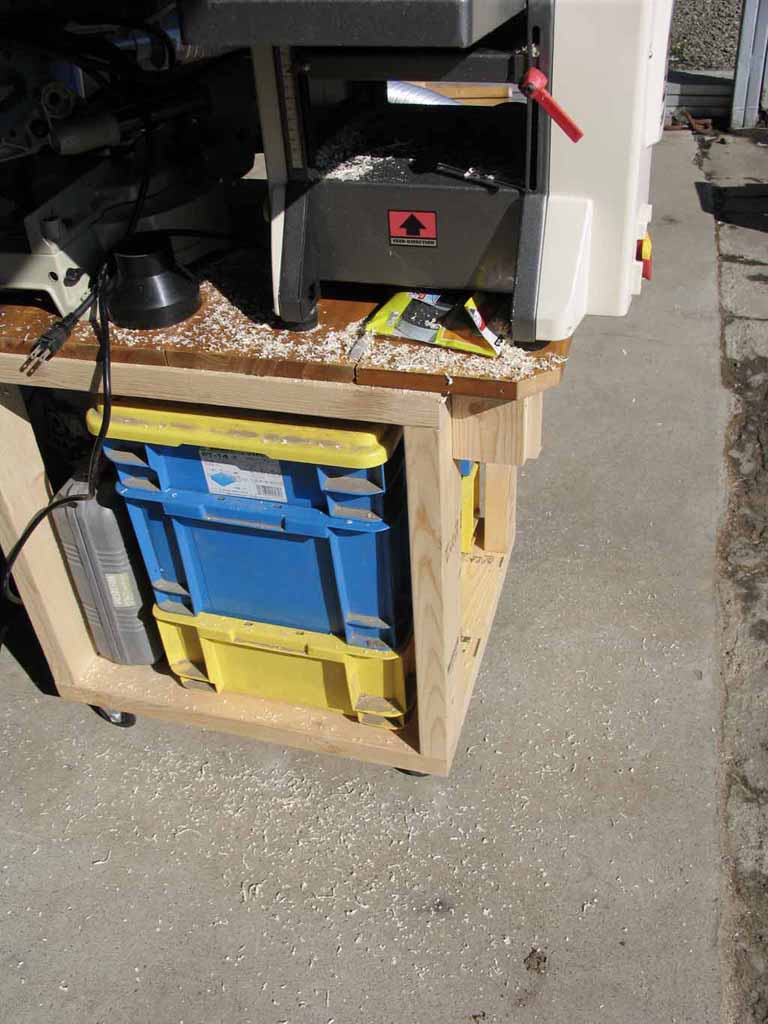 右下の黄色いカゴは木っ端入れ。棚の上の開いている部分はジグ置き場にでも利用しようと思っています。棚の左側にはお大きい材料用の端材置き場。3x6版の板材まで置くことができます。